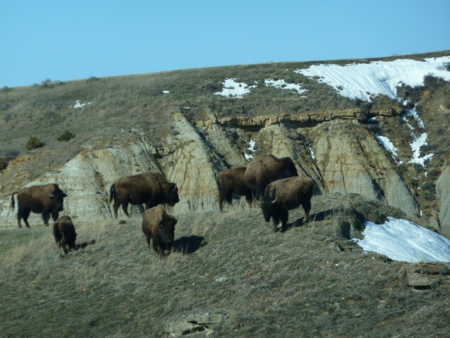 The summer season starts the first week of May, and as I was, as usual, early, I again was the only camper in Cottonwood campground, the same campground that I was in last year. Bison are prolific here and I was greeted by a few when I choose my site. Two hundred yards of grassland that stops at the Little Missouri River and meets the buttes on the other side. Not a bad view for a mere $2.50 daily winter rate camping fee.
